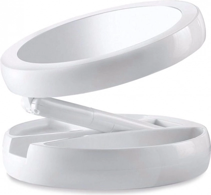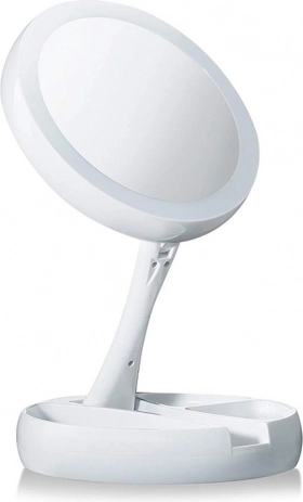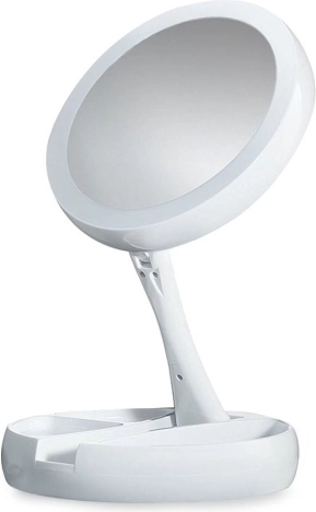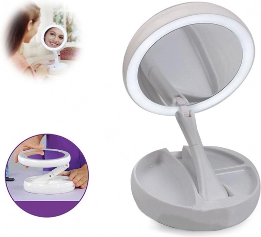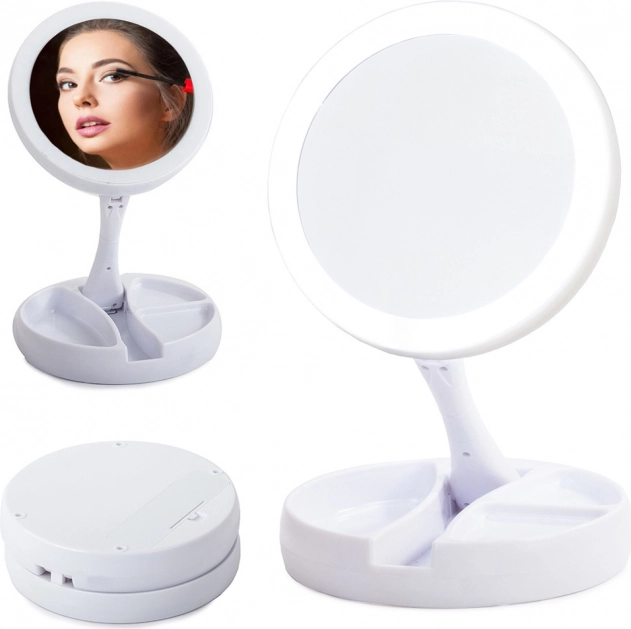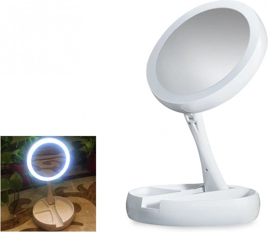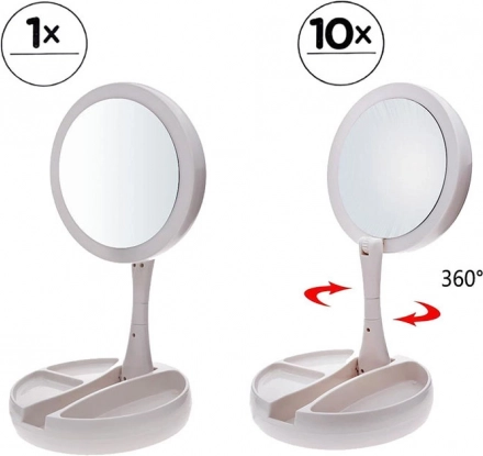O oglindă cosmetică practică de birou, cu iluminare LED circulară pentru machiaj impecabil și îngrijirea tenului. Oferă mărire 1× și 10×, rotație la 180° și compartimente de depozitare pentru cosmetice. Datorită alimentării cu 4× AA sau 5 V prin Micro USB, este ideală pentru baie și pentru călătorii.
