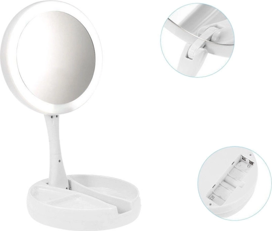 Baza stabilă cu compartimente pentru mărunțișuri păstrează la îndemână pensulele, penseta sau rujul. Construcția cu rabatare/rotire la 180° facilitează setarea unghiului ideal. Alimentarea este flexibilă: baterii 4× AA sau 5 V prin Micro USB – perfectă pentru masa de toaletă de acasă și pentru călătorii.