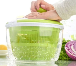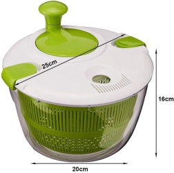 Fără salată îmbibată cu apă. Această centrifugă spațioasă, cu o capacitate de 5 l, datorită mecanismului manual, evacuează rapid excesul de apă și păstrează textura crocantă a frunzelor. Recipientul transparent permite controlul procesului și, după centrifugare, servește ca bol mare pentru amestecarea și servirea salatelor.