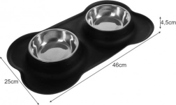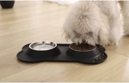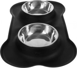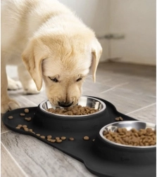 Oferiți-i companionului vostru o hrănire confortabilă și curată. Două boluri din inox cu volum de 2 × 450 ml sunt integrate într-un covoraș flexibil din silicon, care captează apa vărsată și hrana împrăștiată. Covorașul în formă de os are margine înălțată și tratament antiderapant, astfel încât rămâne pe loc chiar și în timpul meselor entuziaste.