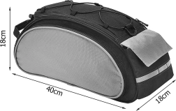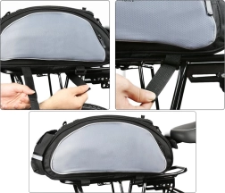 Butonierele de cauciuc de pe clapetă permit depozitarea sigură a unei jachete sau sticle, în timp ce benzile reflectorizante îmbunătățesc siguranța pe drumuri. Designul universal se potrivește pe majoritatea suporturilor de bicicletă, iar cataramele reglabile fac montajul rapid și ușor.