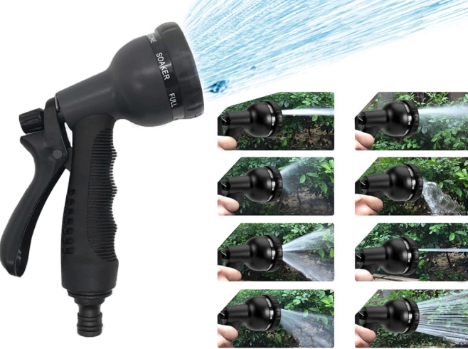 Pachetul include, de asemenea, un pistol multifuncțional de pulverizare cu opt moduri de spray. Blocarea ușoară a trăgaciului cu un cârlig metalic vă permite să reglați debitul de apă fără a ține pârghia apăsată. Mânerul ergonomic antiderapant asigură o prindere confortabilă și sigură.