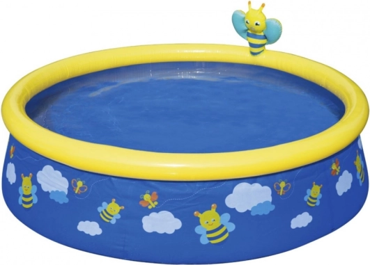 Piscină drăgălașă pentru copii, cu construcție cu braț de sprijin și motiv cu albinuțe, oferă răcorire și distracție în zilele toride. Pulverizatorul în formă de albină se conectează la furtunul de grădină, gulerul gonflabil asigură confort și stabilitate, iar volumul de până la 447 l oferă suficient spațiu pentru joacă în apă.