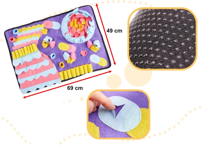 Un covoraș mare înseamnă mai multe opțiuni. Un număr mare de cutii de depozitare pentru recompense îi va oferi animalului tău de companie multa distracție. Poți fi sigur că distracția nu se va termina prea curând. Un astfel de puzzle mic la masă influențează pozitiv dezvoltarea companionului tău.