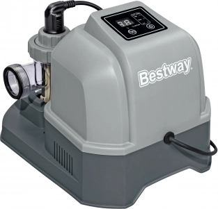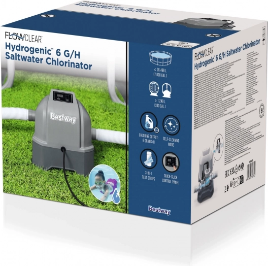 | Dispozitiv pentru curățarea apei din piscine, potrivit pentru toate tipurile de surse de apă. | - compatibil cu piscine până la 7000 gal (26498 l) și necesită un debit minim de 330 gal (1249 l), - utilizează sare pentru a produce clor care menține piscina curată și, în același timp, este blând cu pielea, ochii și părul, - panou de control ușor de utilizat cu funcție de blocare automată, - mod de autocurățare automat, - include adaptoare pentru majoritatea piscinelor, - include 50 de benzi de testare, - debit de clor 6 g/h. | .