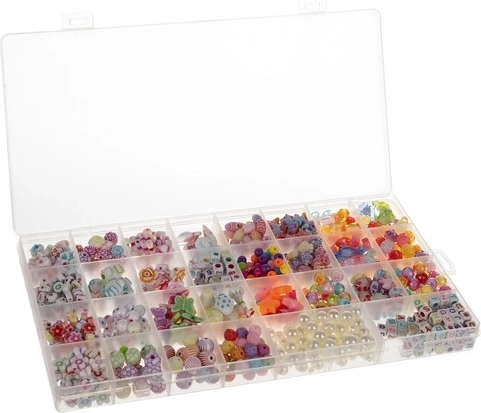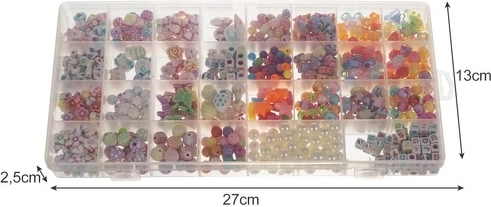 - Set XXL în organizator - 900 de componente colorate permit crearea diferitelor tipuri de bijuterii. Setul include de asemenea banderole, sfoară, încuietori și îmbinări.