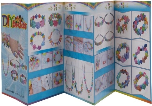 Broșură colorată cu instrucțiuni pentru crearea de coliere și brățări, care le arată copiilor diferite modele.