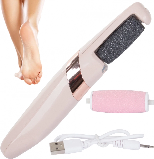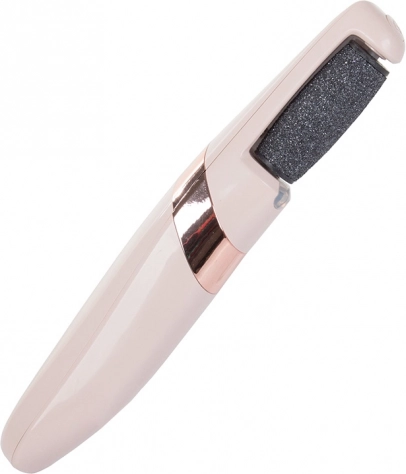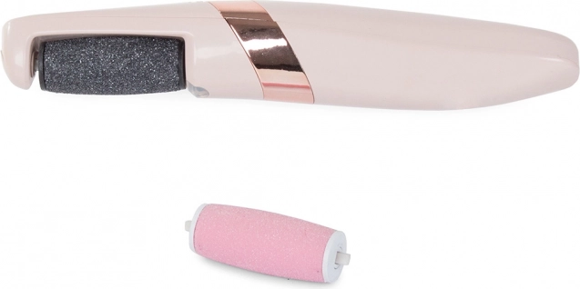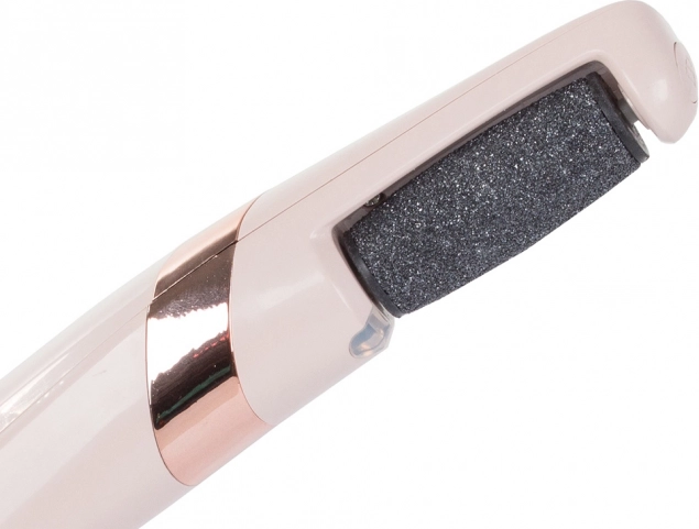 Pila electrică este echipată cu un cilindru abraziv acoperit cu particule microabrazive, rotind la 360°, care îndepărtează delicat și eficient pielea îngroșată și aspră fără risc de tăieturi.
