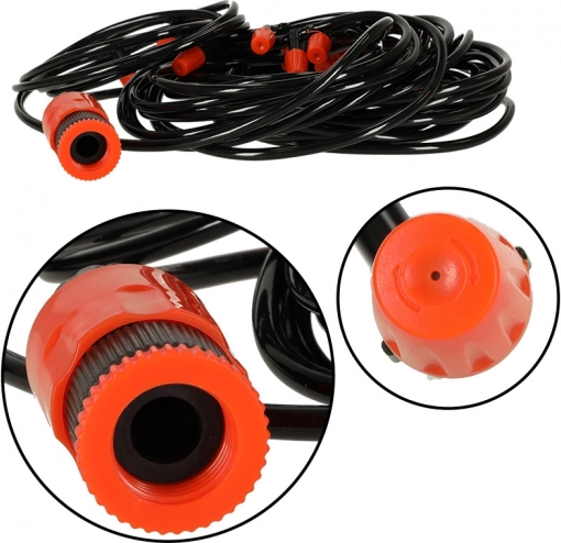 Furtunul se conectează ușor la un furtun de grădină standard sau direct la robinet. Reglarea debitului la duze permite adaptarea intensității ceții în funcție de zone. Datorită posibilității de scurtare a furtunului, ajustați pasul dintre duze exact după nevoi și direcționați apa acolo unde este cel mai necesar.