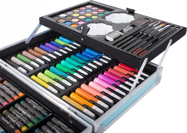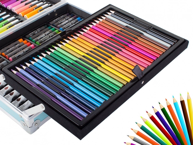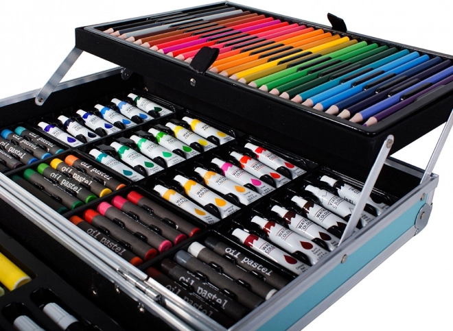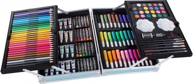 Setul include o gamă largă de creioane pastel cu ulei, markere, acuarele și alte instrumente utile.