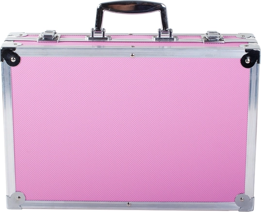 Servietă de culoare roz, cu colțuri metalice oferă protecție robustă și ușurință în transport datorită mânerului.