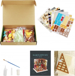 Tot ce ai nevoie este inclus în pachet – de la piese pre-decupate din placaj la elemente din hârtie și material textil, până la adeziv, vopsele și pensulă. Construcția presupune vopsire și lipire, lucru cu detalii mărunte și asamblare răbdătoare, ceea ce o transformă într-un proiect ideal pentru un weekend liniștit.
