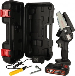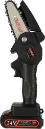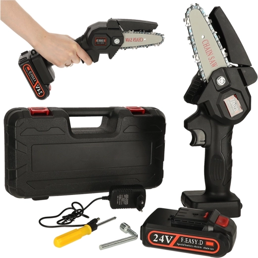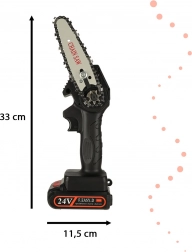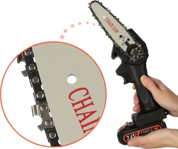 Fierăstrău cu lanț mini cu acumulator portabil, un ajutor de nădejde pentru orice grădinar sau meșteșugar. Datorită greutății reduse și dimensiunilor compacte, se utilizează ușor și permite lucrul eficient chiar și în locuri greu accesibile.