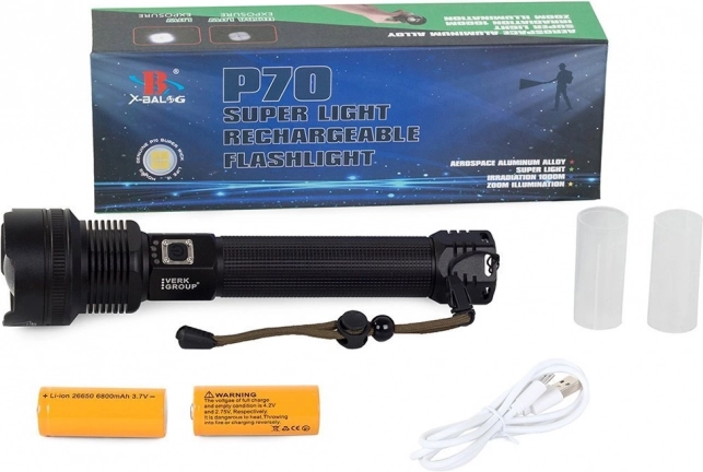 - lanternă P516-P70, 2× baterii 26650, cablu USB, ambalaj original