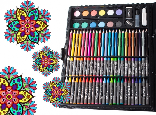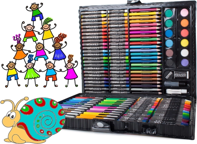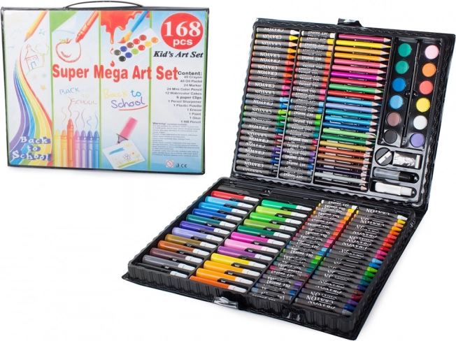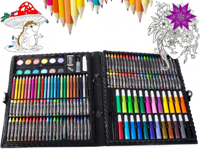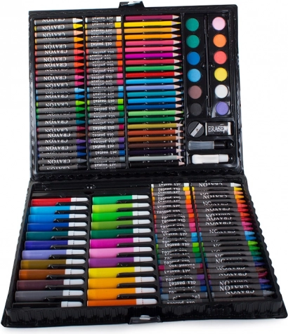 De la creioane colorate și markere până la acuarele – 168 de piese pentru desen, colorat și pictat, depozitate comod într-o valiză bine organizată.