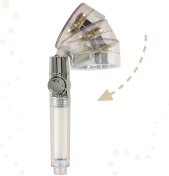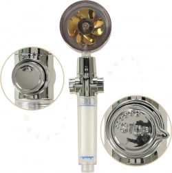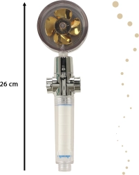 Capul de duș cu turbină aurie este soluția ideală pentru orice baie modernă. Datorită numărului mare de mici orificii și turbinei integrate, îmbunătățește presiunea apei economisind în același timp consumul de apă și costurile facturilor. Filtrul intern ajută la eliminarea problemelor cu apa dură, fiind benefic atât pentru părul, cât și pentru pielea dumneavoastră.
