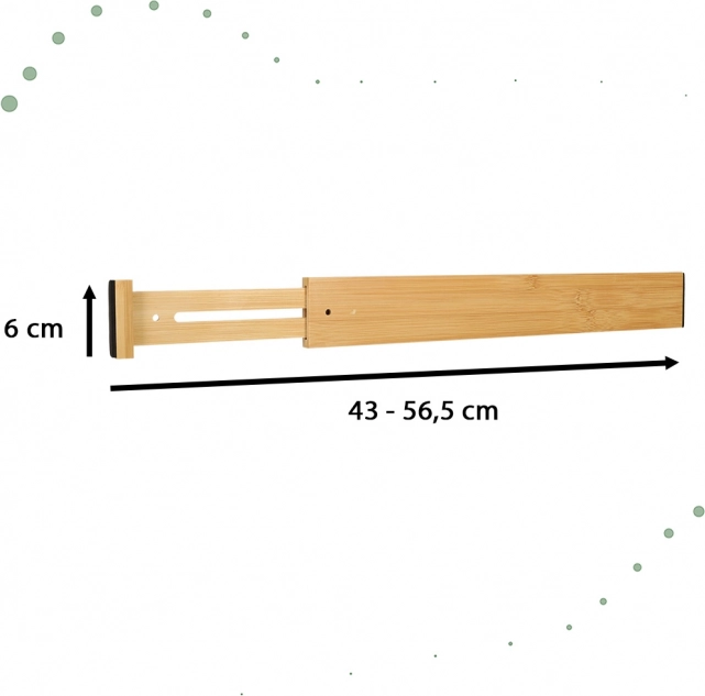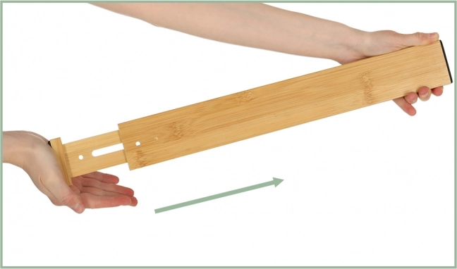Vă prezentăm un ajutor util pentru organizarea de zi cu zi a spațiului din casa dumneavoastră. Acest organizator de bambus permite o separare ușoară a produselor într-un sertar, datorită lungimii sale ajustabile de la 43 la 56,5 centimetri. Este universal și poate fi utilizat în bucătărie, baie sau dulap, chiar și în sertare mai mari.