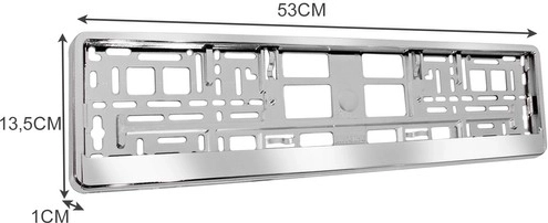 Conținutul pachetului: 2x rame pentru numere de înmatriculare cu dimensiuni 53 x 13,5 x 1 cm și greutate 381 g fiecare, greutatea totală a pachetului 538 g.