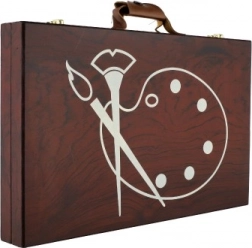 Valiza de lemn plină de culori și unelte este însoțitorul perfect pentru tinerii creatori. Conține tot ce aveți nevoie pentru a picta și desena, într-un ambalaj elegant și ușor de transportat:
