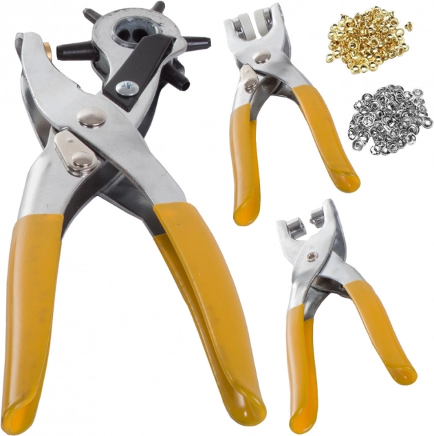 Acest set include trei unelte pentru prelucrarea pielii și accesorii constând în 100 de nituri și 100 de capse. Uneltele sunt fabricate din oțel rezistent la deformare, ceea ce le asigură o durată lungă de viață.