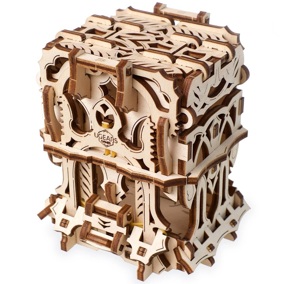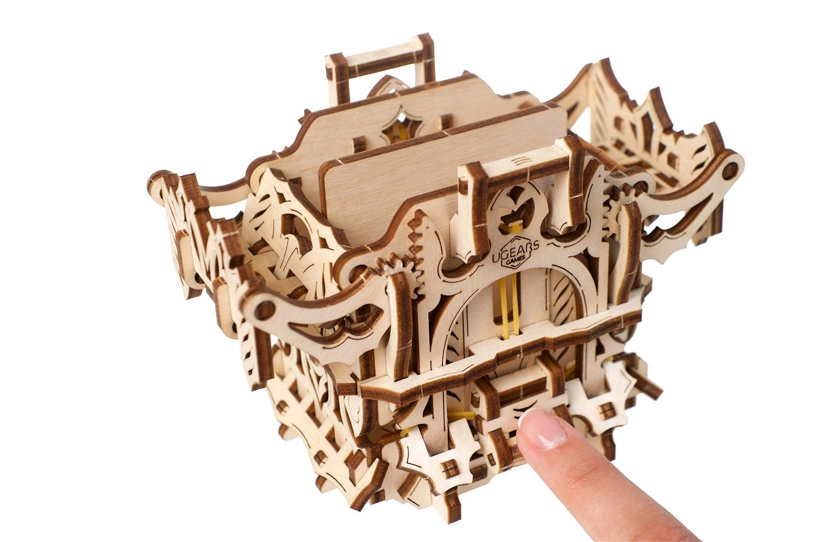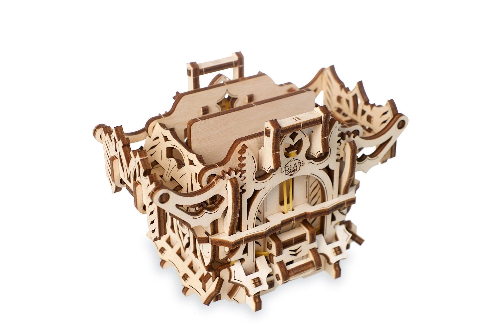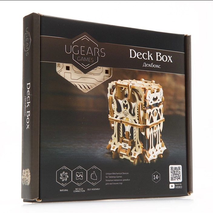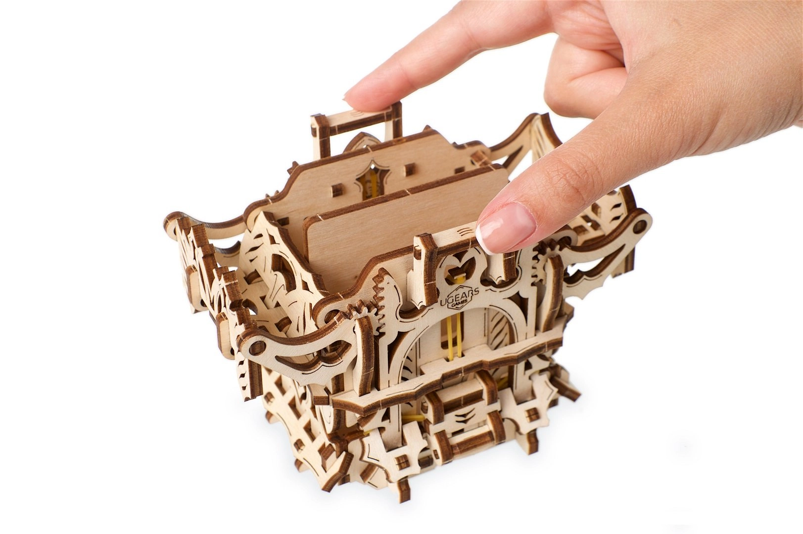 Bucură-te de o combinație inteligentă între design și funcționalitate. Această cutie mecanică pentru cărți oferă depozitare sigură pentru două pachete (fiecare până la 60 de cărți 63,5 × 88 mm) și o deschidere spectaculoasă prin angrenaje și încuietori decupate cu precizie. Se potrivește firesc cu jocurile de societate și de cărți, precum și cu numerele de magie.