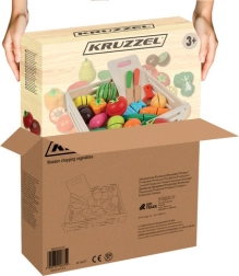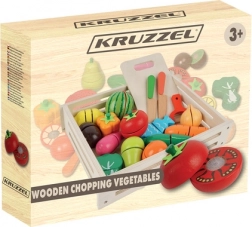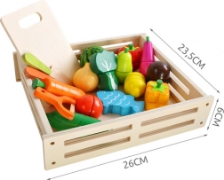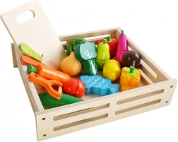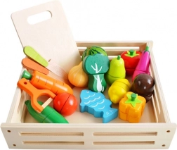 Setul include o lădiță pentru depozitare ordonată, 2 cuțitașe din lemn, un tocător și o imitație de curățător. Dezvoltă motricitatea fină, coordonarea mână–ochi, creativitatea și cooperarea în jocul împreună. Excelent pentru bucătăria de jucărie, grădiniță și călătorii.