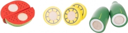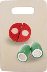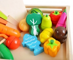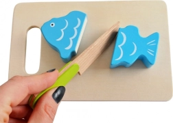Fructele, legumele și peștele segmentate se „taie” ușor cu cuțitașul din lemn și se unesc din nou datorită benzilor cu arici. Antrenament excelent pentru motricitatea fină și jocul de rol.