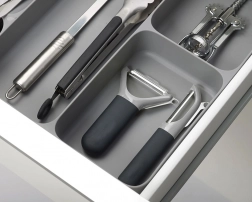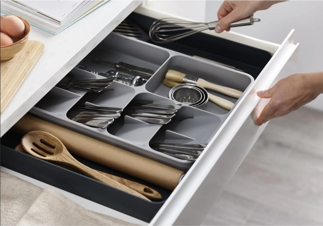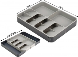 Organizatorul pentru sertarul de bucătărie este conceput pentru a maximiza spațiul și a asigura aranjarea sistematică a tacâmurilor și ustensilelor de bucătărie. Datorită construcției sale extensibile, se adaptează la dimensiuni diferite ale sertarelor.
