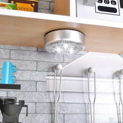 Oferiți-le copiilor propria bucătărie modernă cu multe elemente realiste. Iluminarea LED poate fi plasată sub dulap, în dulap sau în „cuptor” pentru a crea o atmosferă autentică. La rotirea butoanelor ochiurilor se aude un „clic” caracteristic, conferind jocului o nouă dimensiune.