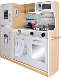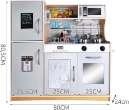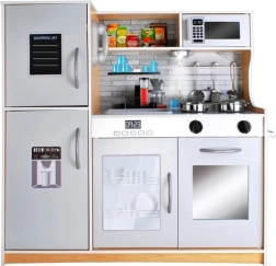 Bucătăria este realizată din lemn de calitate, fiind stabilă, durabilă și sigură. Setul include accesorii metalice bogate – oală, tigaie, capac și 4 ustensile de bucătărie – și o chiuvetă detașabilă pentru „spălarea” ușoară a vaselor. Designul și culorile neutre sunt potrivite atât pentru fete, cât și pentru băieți.