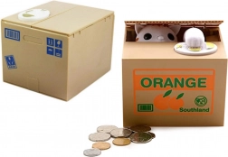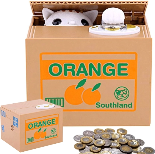 Când introduceți un bănuț și îl apăsați ușor, pisica iese, miaună și ia bănuțul – distracție pentru toată lumea!