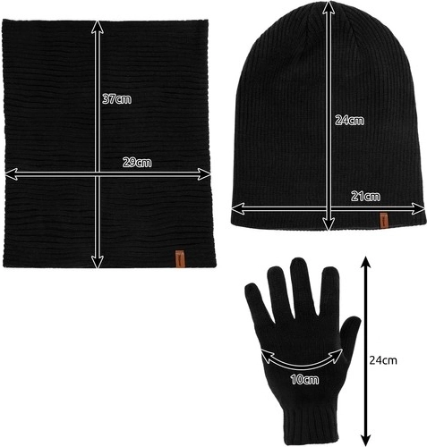 Setul include o căciulă neagră, o eșarfă și mănuși, toate fabricate din acril, ideal pentru sezonul de iarnă.