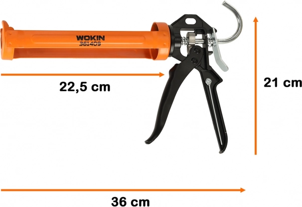 Pistol universal de aplicare WOKIN pentru cartușe cu silicon, acril și adezivi, oferă corp rotativ 360°, construcție metalică și mâner ergonomic pentru aplicare precisă și confortabilă a materialelor de etanșare la montaj, etanșare și lucrări de finisare.
