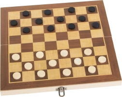 Jucați jocul de dame pe tabla din lemn cu două fețe, pe care o pliați ușor și o închideți în siguranță după joc.