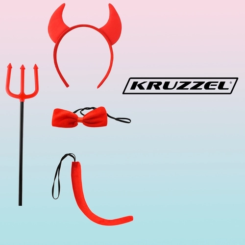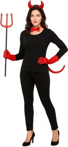Costum drăcușor 4 în 1: coarne, papion, coadă, trident. Mărime universală, purtare confortabilă, ideal pentru Halloween, carnaval și petreceri.