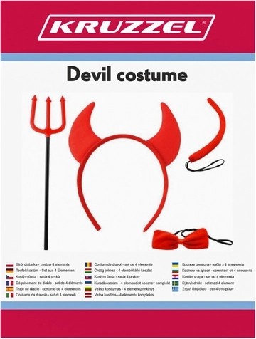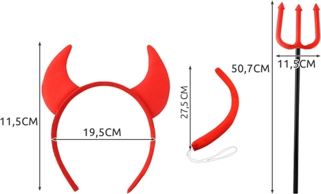 Tridentul din plastic ușor și coarnele pe bentiță completează costumul și arată grozav în fotografii.