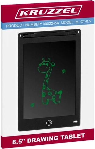 Tabletul pentru desen Kruzzel este echipat cu un ecran de 8,5" care reacționează la atingerea oricărui obiect, chiar și cu unghia. Deasupra ecranului se află un suport pentru creionul de desen, care permite depozitarea comodă.