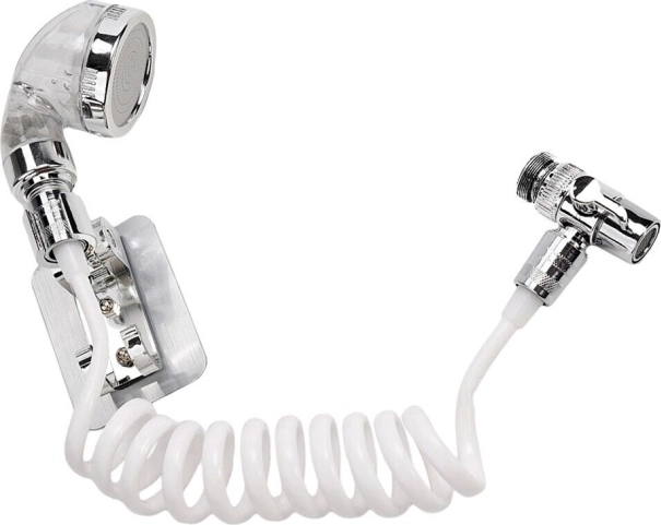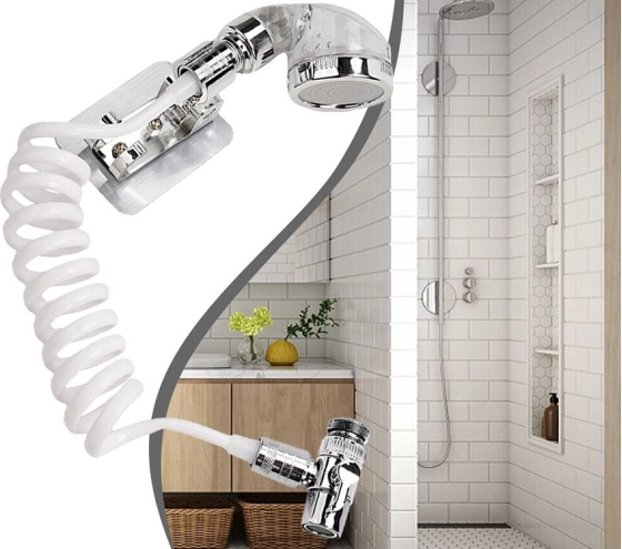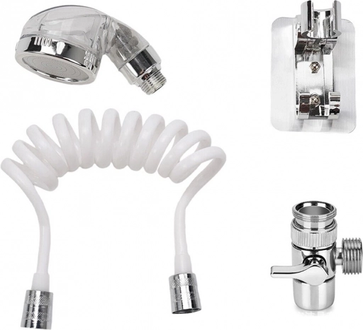 - Include un furtun conectat la mânerul dușului, care poate fi montat cu ușurință pe perete.