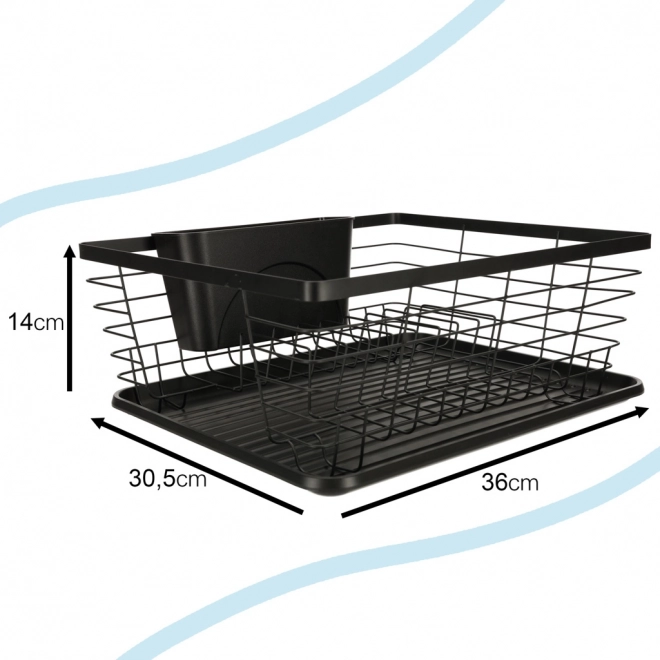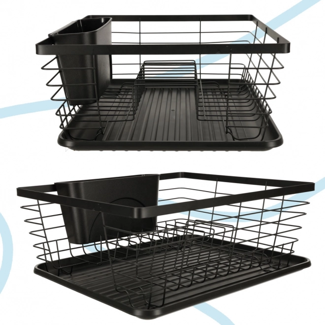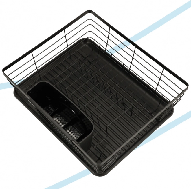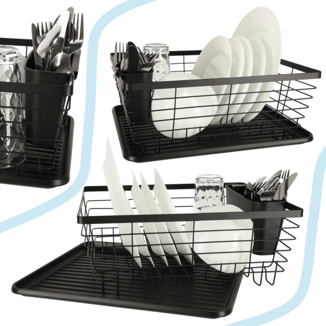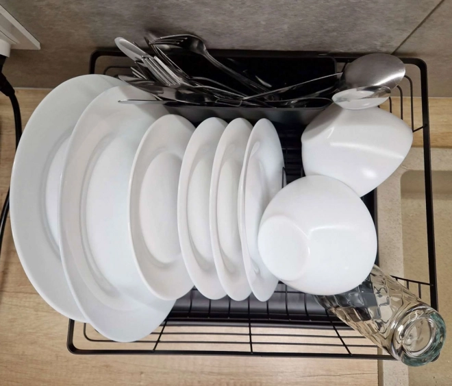 Suportul de scurgere negru, elegant, îmbină designul modern cu practicitatea. Oferă capacitate mare, recipient separat pentru tacâmuri și tavă de scurgere care mențin blatul de bucătărie uscat și curat. Construcția metalică robustă cu tavă din plastic asigură durabilitate îndelungată și întreținere ușoară.
