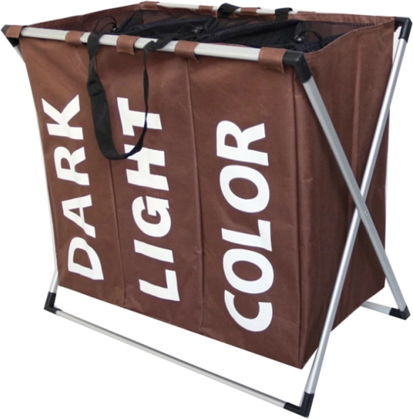Acest coș de rufe triplu are trei compartimente separate, fiecare fiind etichetat pentru organizare facilă. Materialul compartimentelor este rezistent la apă, permițând depozitarea rufelor umede fără a risca deteriorarea altor articole.