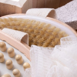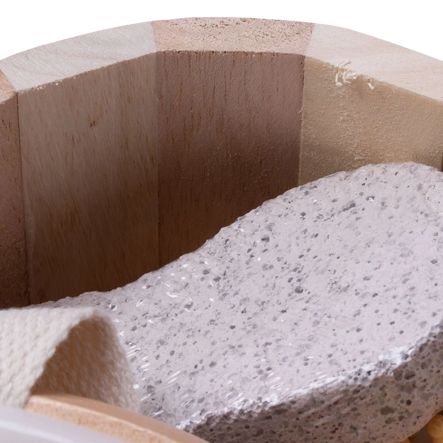 Peria de masaj cu noduri din lemn, periuța fină și piatra ponce ajută la îndepărtarea pielii îngroșate și la susținerea circulației.