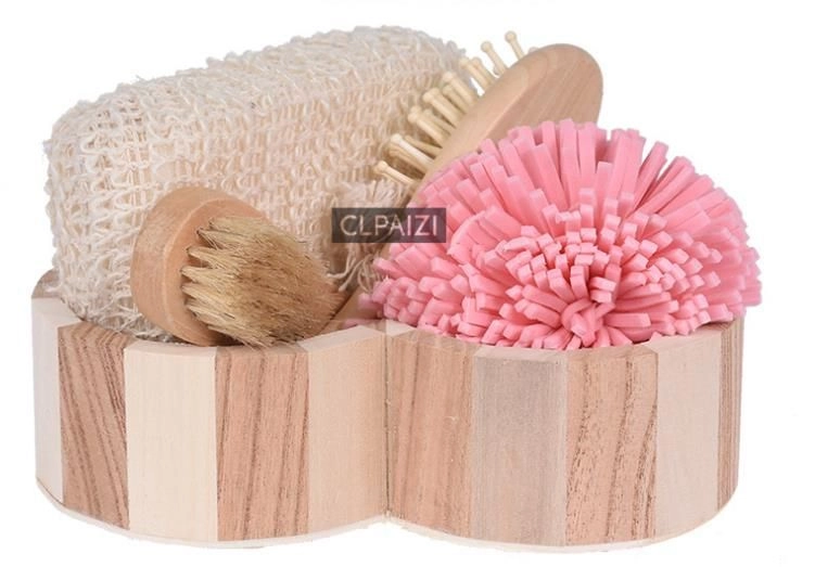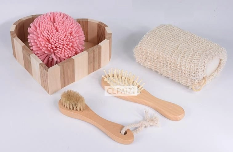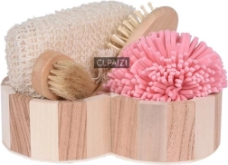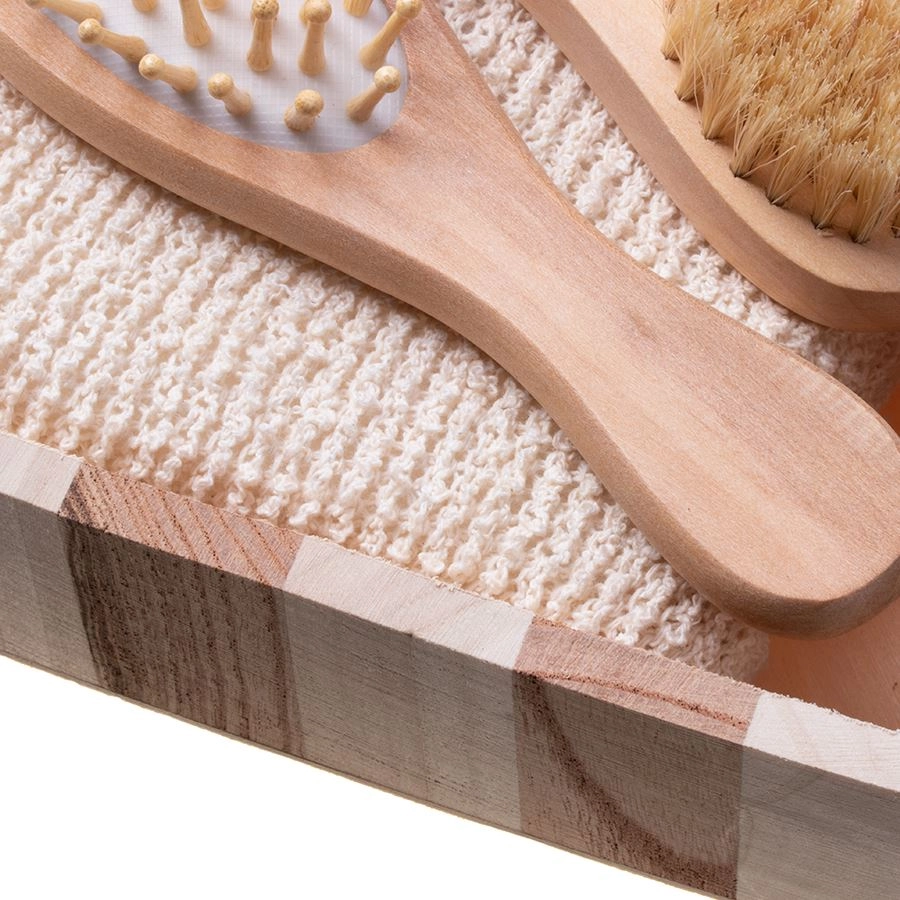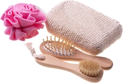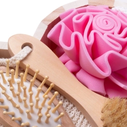 Acest set spa din 4 piese este așezat într-un coșuleț elegant din lemn în formă de inimă (cca 5,5 × 20 × 20 cm) și oferă un ritual complet pentru wellness acasă. Combinația de bureți de baie, perie delicată pentru corp și perie de păr asigură curățare temeinică, exfoliere blândă și masaj plăcut.
