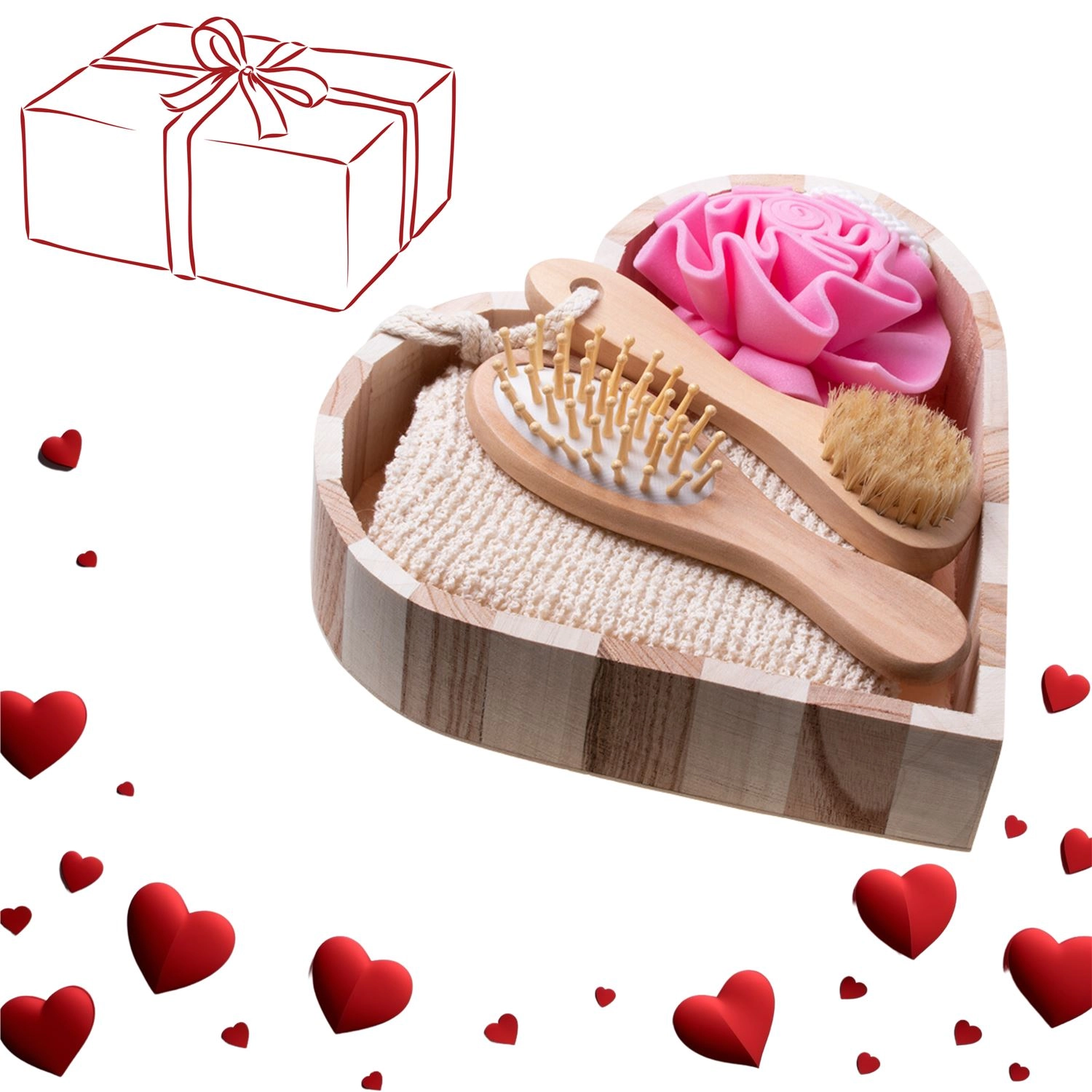 Elegantul set cadou pentru baie, într-un coș din lemn în formă de inimă, oferă totul pentru relaxare și îngrijirea corpului. Conține perie de păr, perie delicată cu peri naturali și 2 bureți de baie pentru exfoliere blândă, stimularea circulației sanguine și o piele mai netedă și mai luminoasă – un cadou grozav pentru orice ocazie.