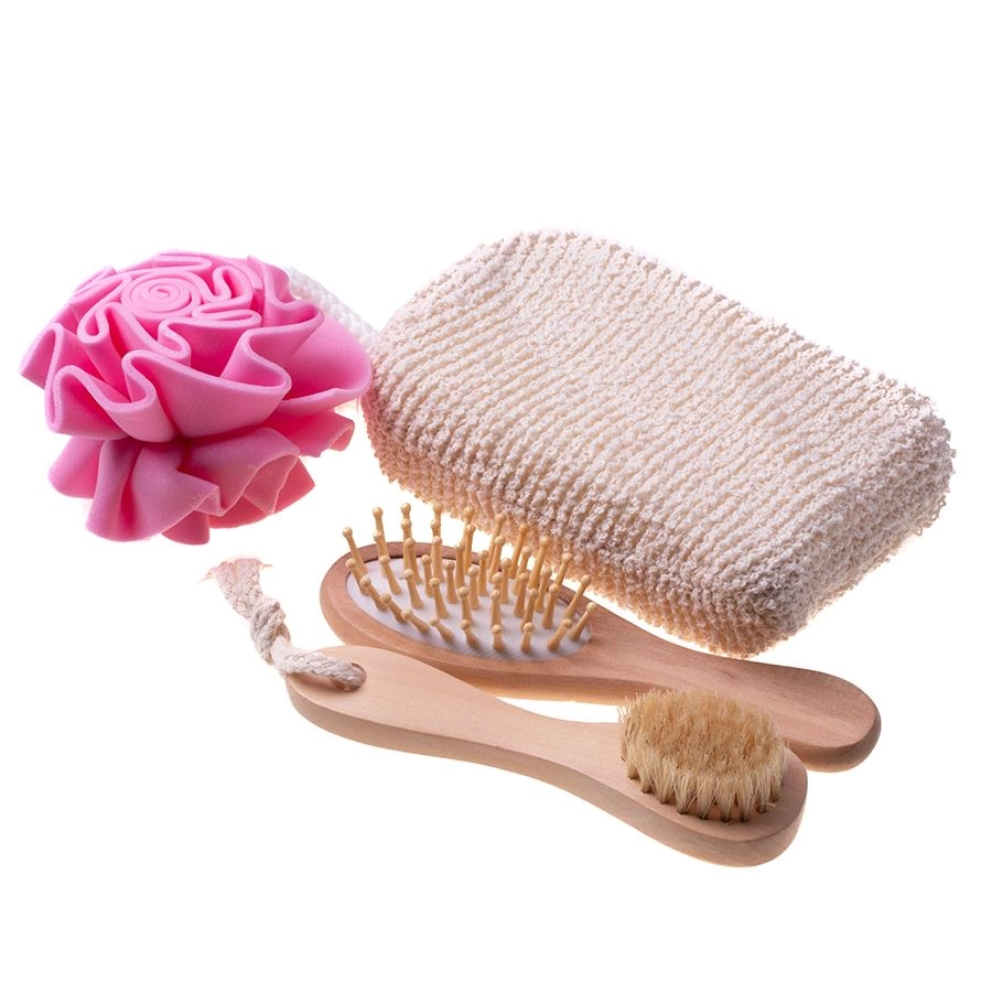 - Perie de păr, perie de corp cu peri moi, 2 bureți de baie, coș cadou