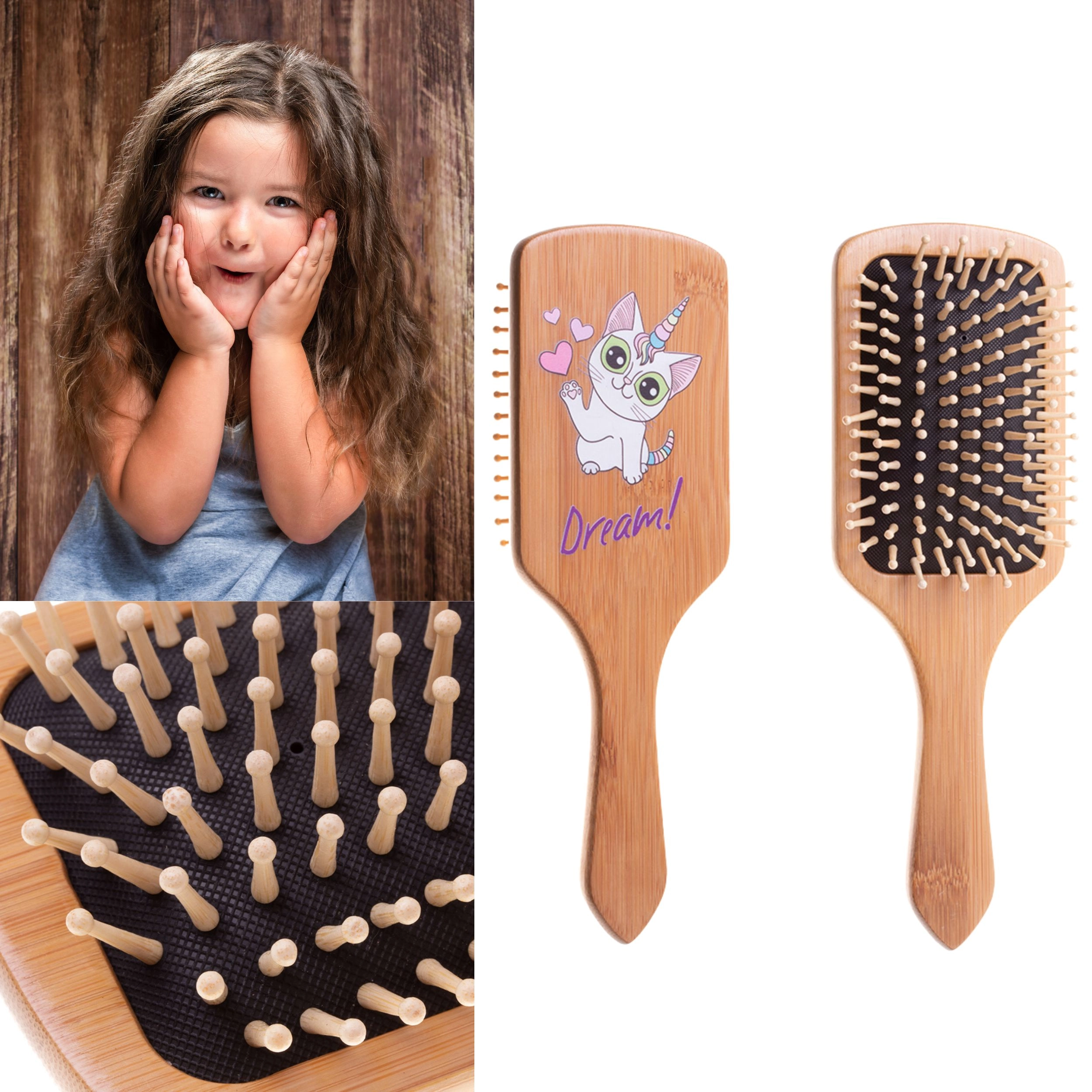 Datorită materialelor naturale, peria este durabilă, ușoară și potrivită pentru părul drept sau ondulat al copiilor. Vârfurile rotunjite protejează scalpul sensibil și ajută la distribuirea uniformă a sebumului natural pe lungimea firului pentru o strălucire firească. Designul cu pisică-unicorn și inscripția „Dream!” îi încurajează pe copii să se pieptene singuri.