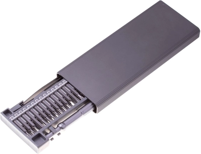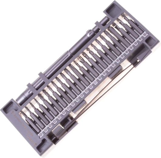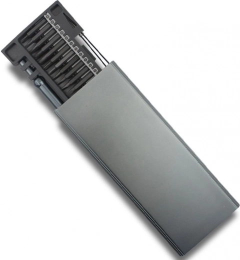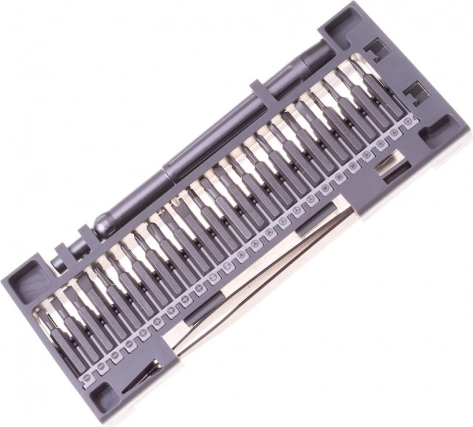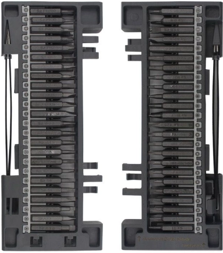 Setul de șurubelnițe este ambalat într-un organizator practic cu închidere, cu șurubelnițe accesibile pe ambele părți. Setul este format din 48 de piese, fabricate din oțel de înaltă calitate. Include un pachet cuprinzător de biți, depozitați într-o matriță practică din plastic.