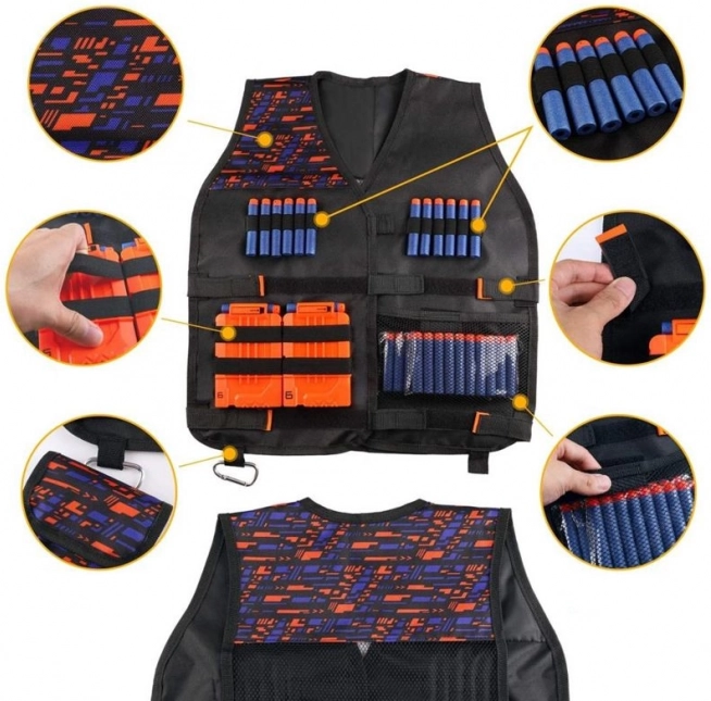 Conținutul setului: Setul include o vestă tactică rezistentă, ochelari de protecție, 30 de săgeți, un bandană/mască imprimată pentru față, o bandă pentru muniție purtată la încheietură și un încărcător suplimentar de muniție.