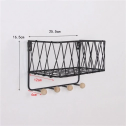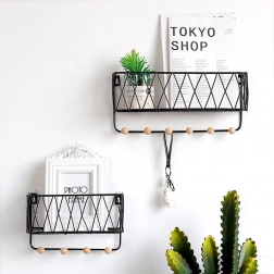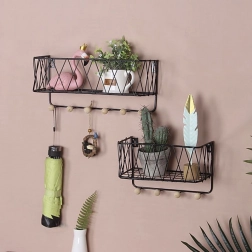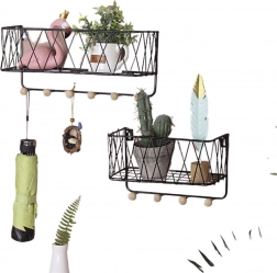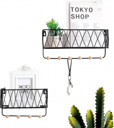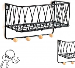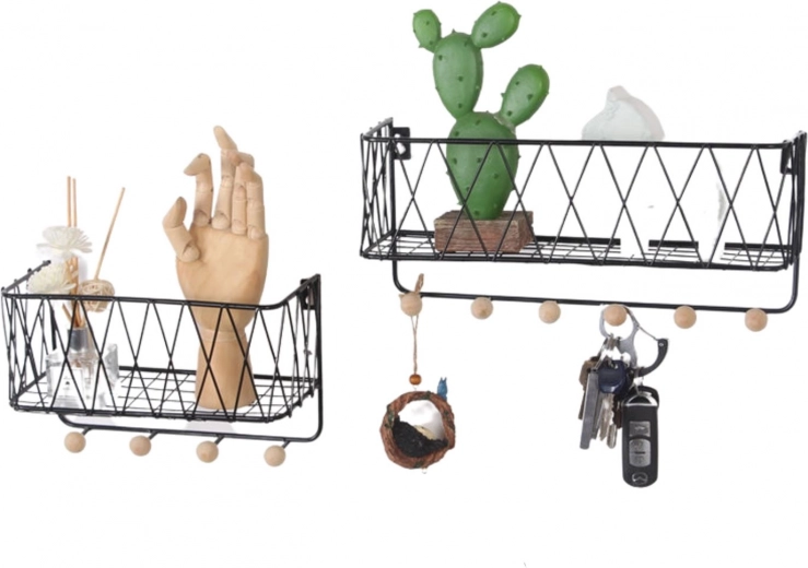 Raftul modern din sârmă îmbină designul și funcționalitatea. Suprafața superioară găzduiește decorațiuni și obiecte mici, în timp ce cârligele inferioare păstrează cheile, eșarfele sau gențile ușoare ordonate și la vedere. Finisajul negru se potrivește ușor cu majoritatea interioarelor și are un aspect curat, atemporal.