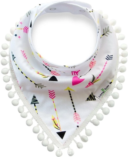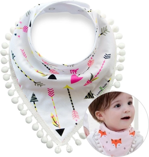 Această eșarfă adorabilă pentru copii, cu ciucuri, este un accesoriu grozav pentru gât, care funcționează foarte bine și ca bavețică pentru perioada erupției dentare a copilului. Sistemul de prindere confortabil, cu capse, nu apasă copilul, iar marginea este de asemenea reglabilă.