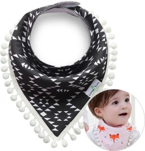 Această eșarfă drăguță pentru copii, cu ciucuri, este un accesoriu grozav pentru gât, care funcționează foarte bine și ca bavetă pentru perioada erupției dentare. Sistemul de închidere confortabil, cu capse, nu strânge copilul, iar marginea este de asemenea reglabilă.